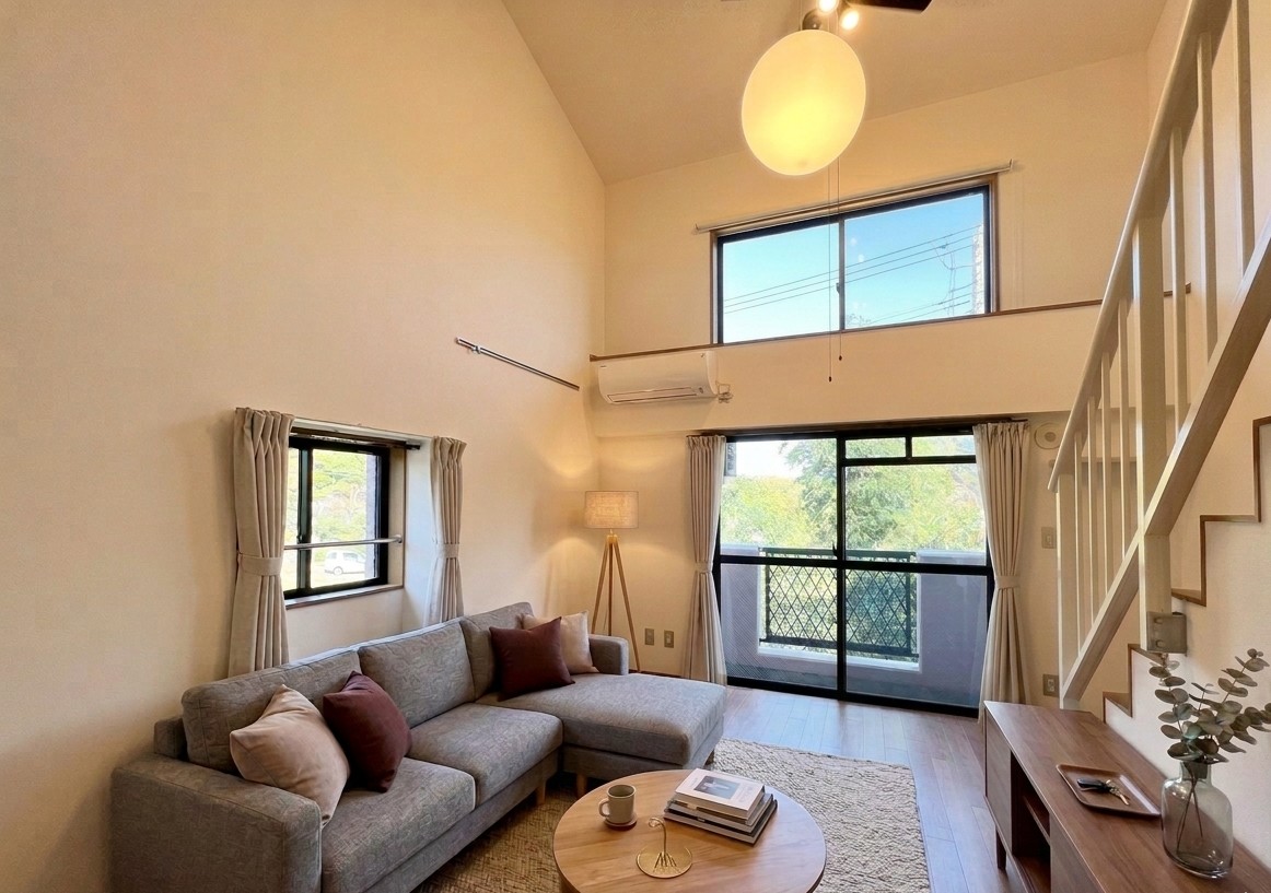希少なペット可メゾネット!吹抜けが創る開放感あふれる暮らし 天井高のある吹抜けとシーリングファンが魅力の2K 。ゆとりある一人暮らしやカップルに最適なデザイナーズ